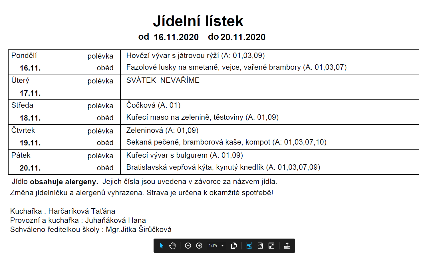 Jídelníček pro cizí strávníky 16. - 20. 11. 2020