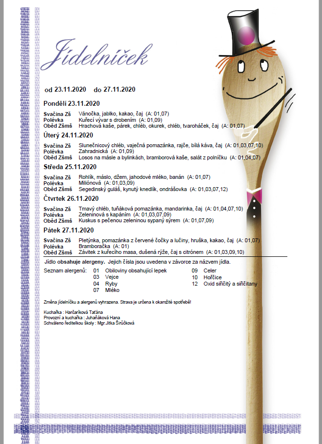 Jídelníček pro MŠ 23.- 27. 11. 2020