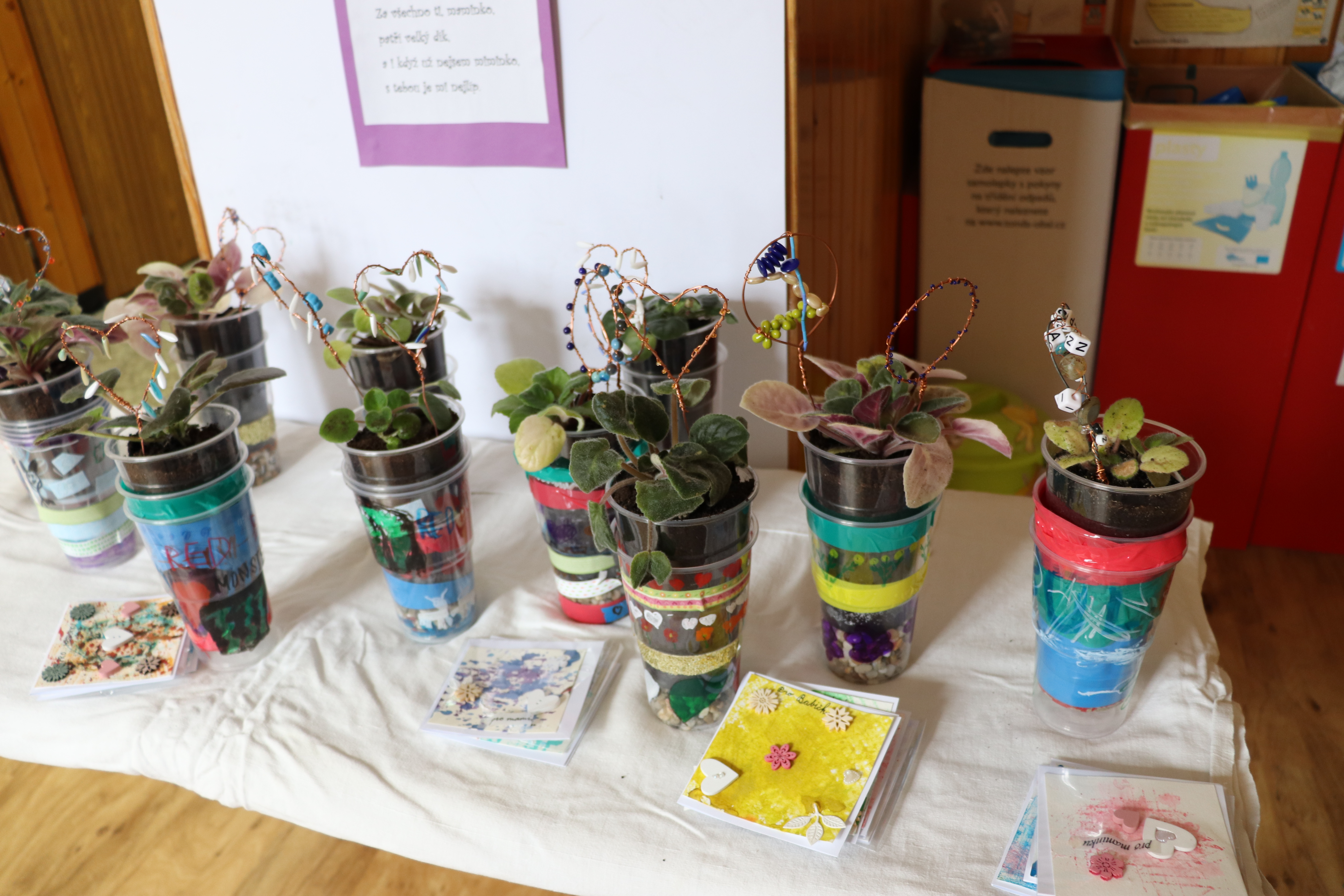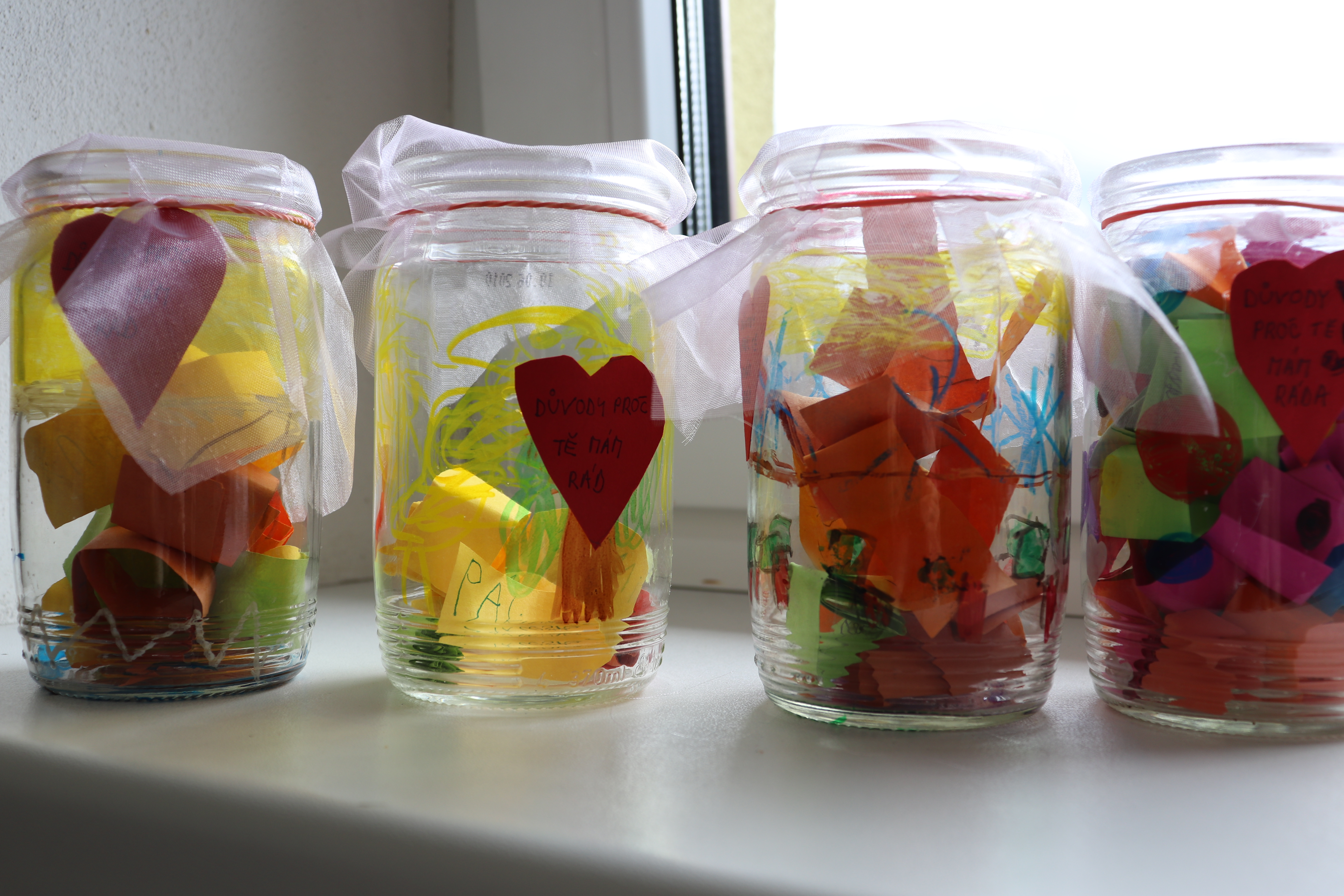 Ke dni matek děti vyráběly dárky. Prvňáčci s Bětkou vyzdobili sklenici, kterou naplnili důvody, proč mají rády maminku.