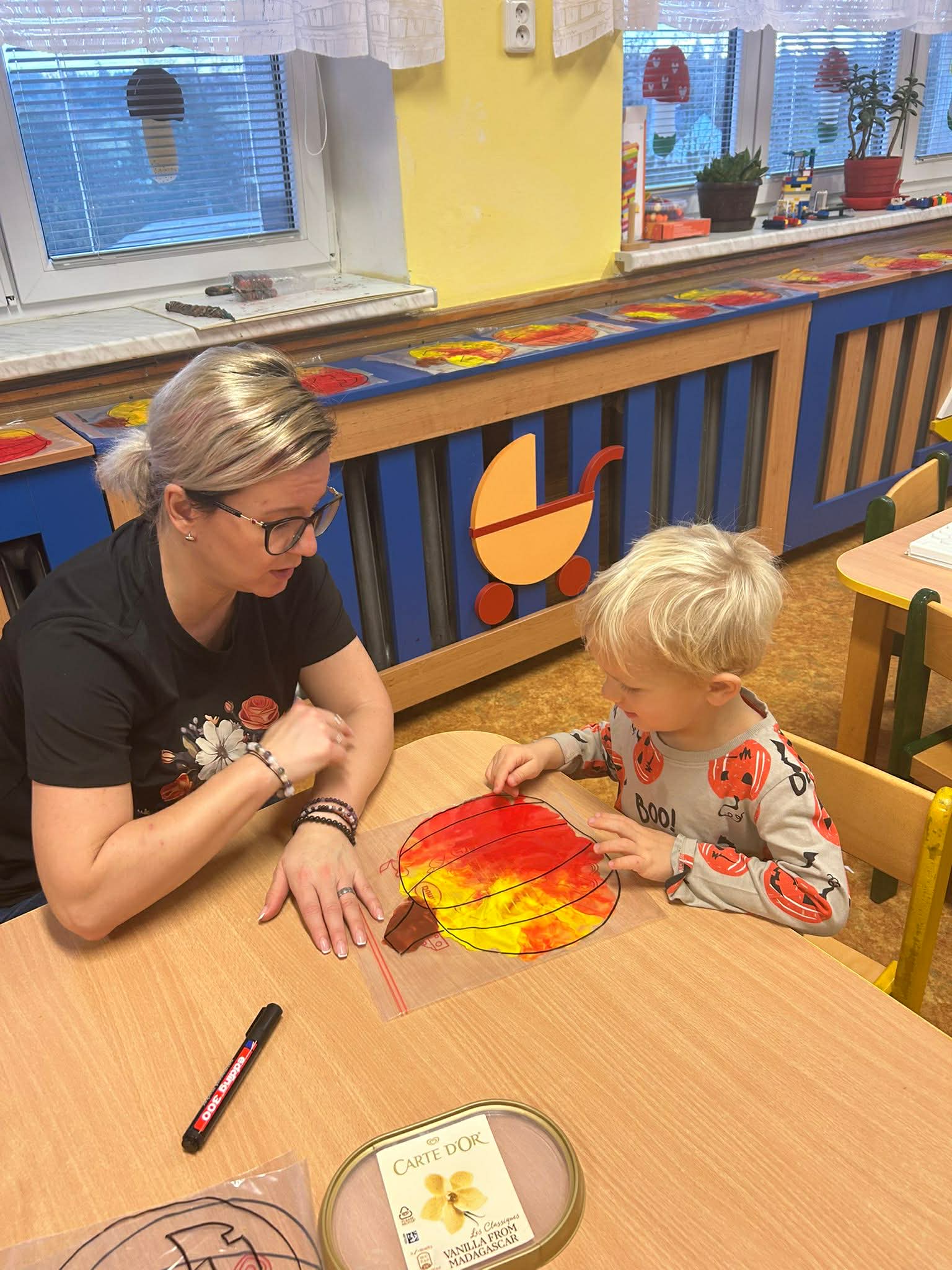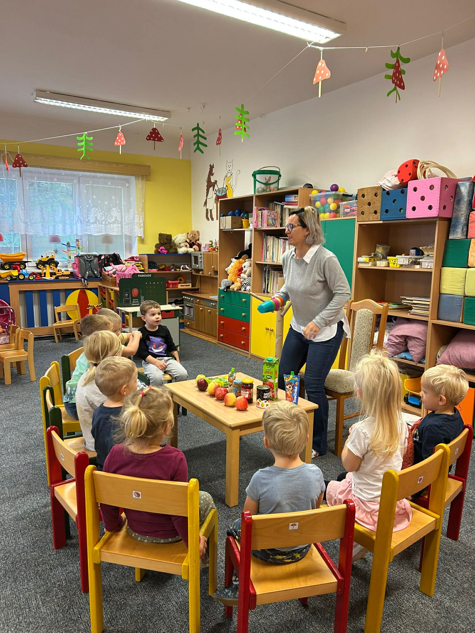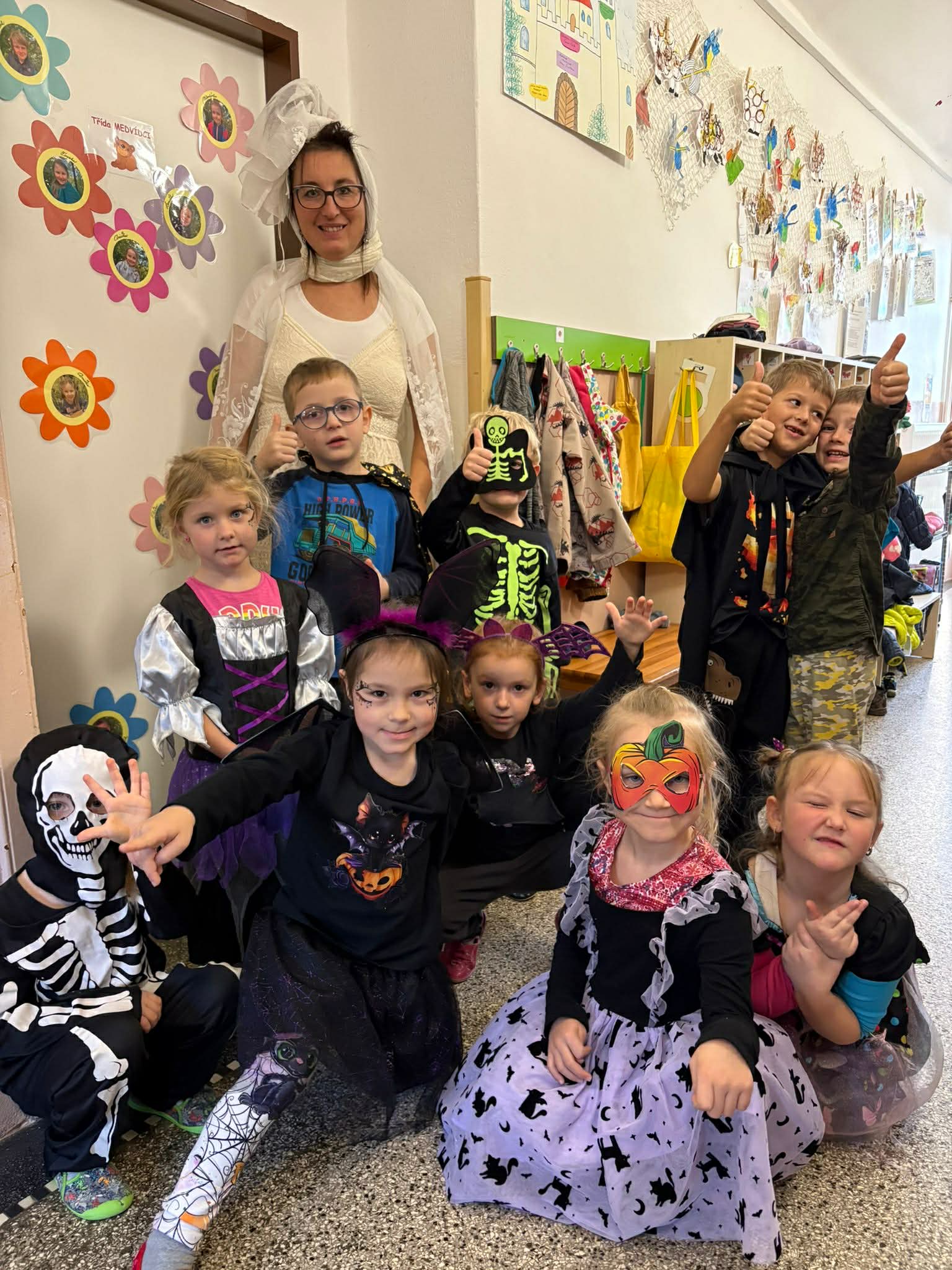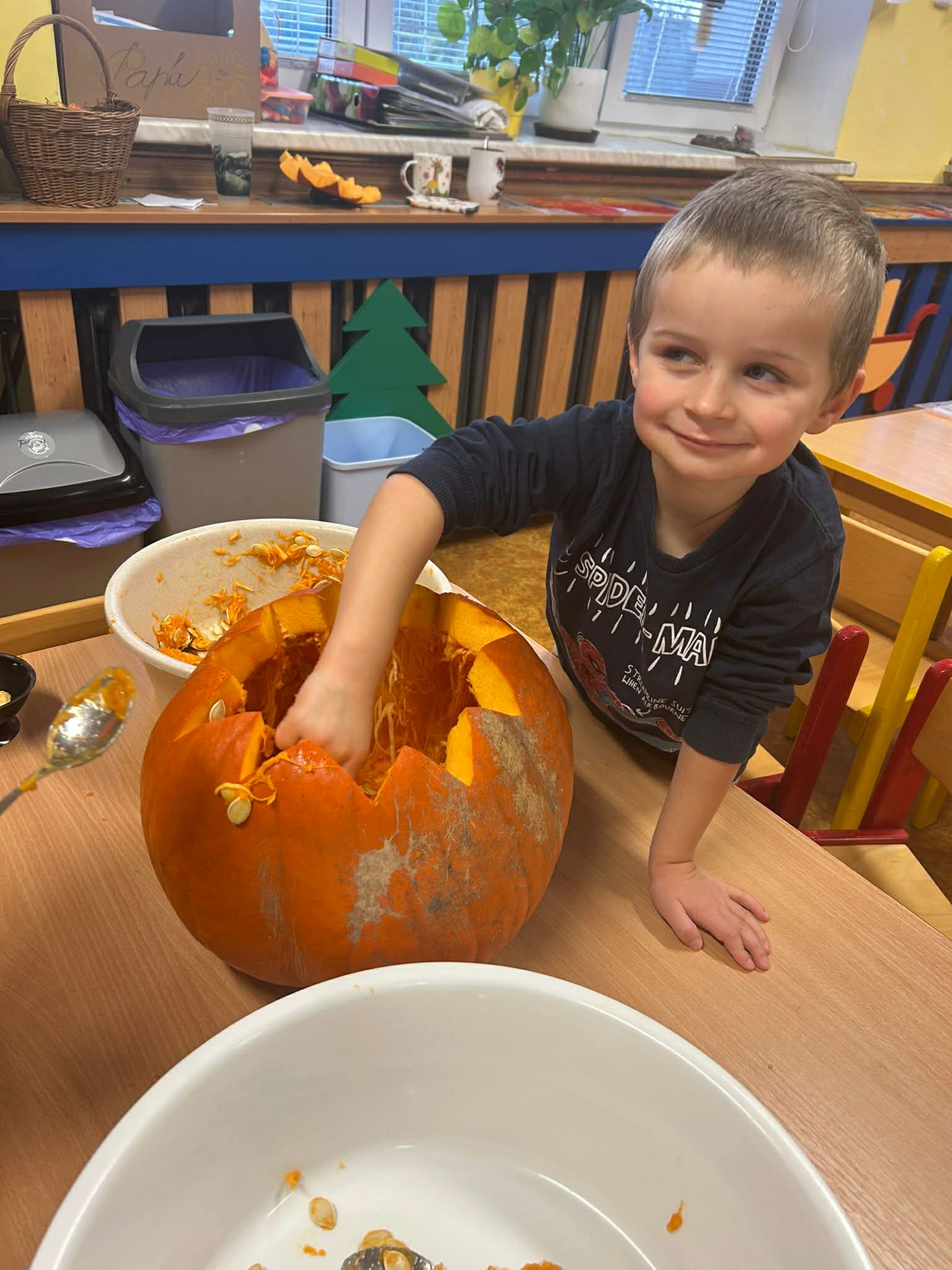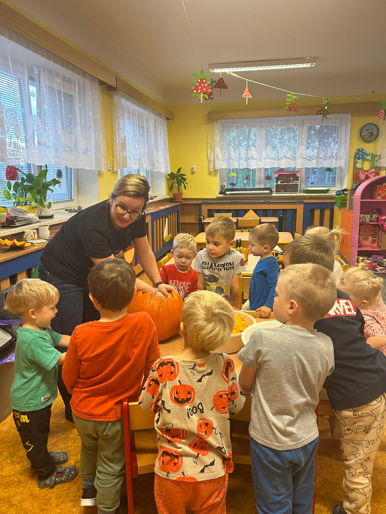 Nový školní rok začal krásným, teplým podzimním počasím, tak jsme s dětmi mohly užívat krásy naší školní zahrady a přírody kolem nás. Procházky do přírody, lesů a k místním rybníkům, vypouštění rybníka Špinka, hledání stop a pokladů na dně vypuštěného rybníka byl obrovským zážitkem. Zúčastnily jsme se tradičního olešenského posvícení, kde si děti užily jízdu na povozu taženým koňmi. Při podzimní dílničce nám rodiče pomohli vyzdobit venkovní prostory kolem mateřské školy. Další vydařenou podzimní akcí byla drakiáda u místní sokolovny, kde si na závěr děti s rodiči opekli buřty. Podzim nám také odstartoval náš první sportovní kurz, kterým bylo bruslení na zimním stadionu v Náchodě. Následovaly další kurzy - plavaní v trutnovském bazéně, lyžařský kurz v Mladých Bukách a závěrem nás čeká in-line bruslení v naší vesnici pod vedením lektorky Jany Benešové. Podzim završila oslava Halloweenu, dlabání dýní, čarování, převleky a vzpomínka na naše zemřelé - Dušičky.