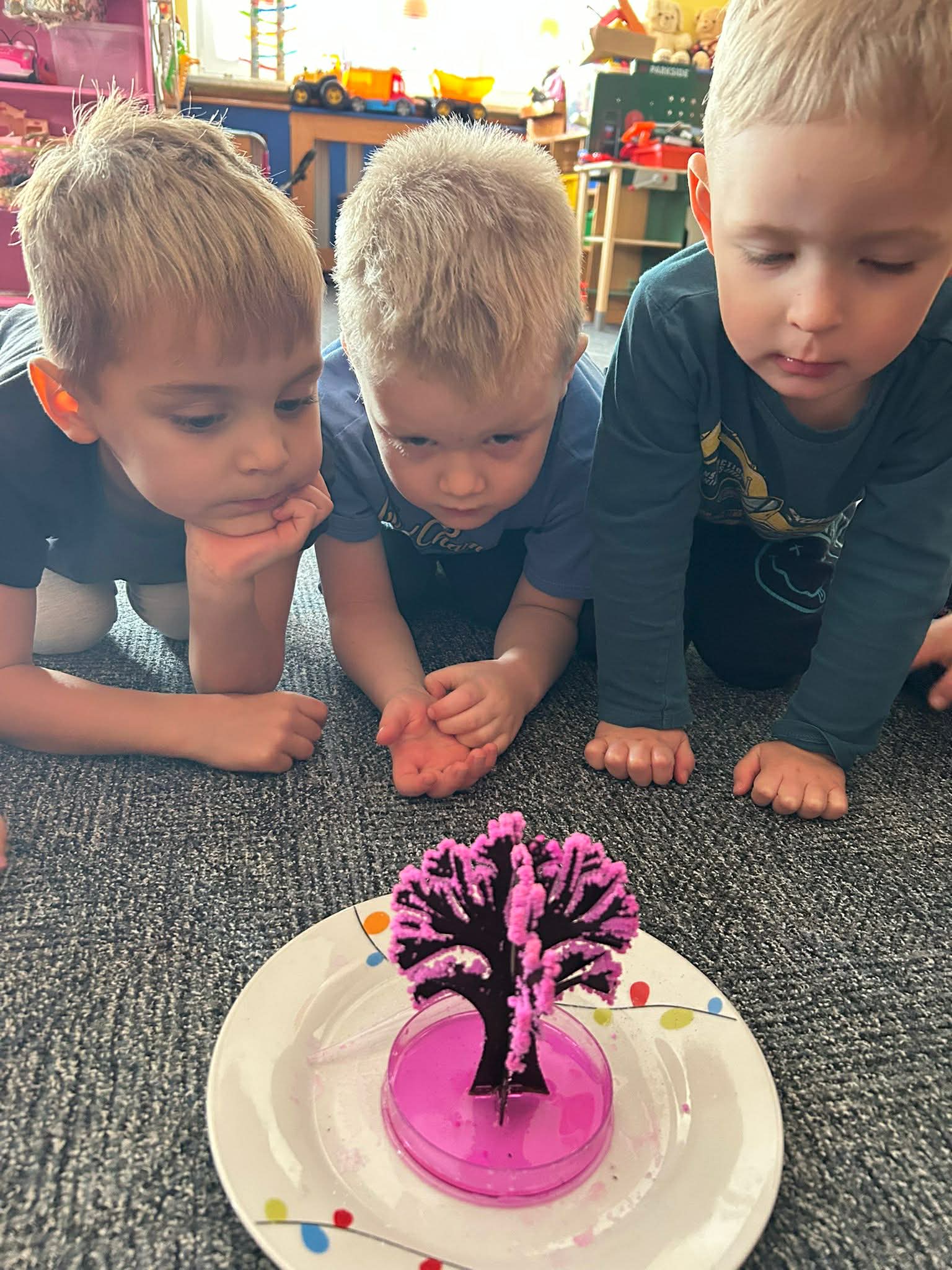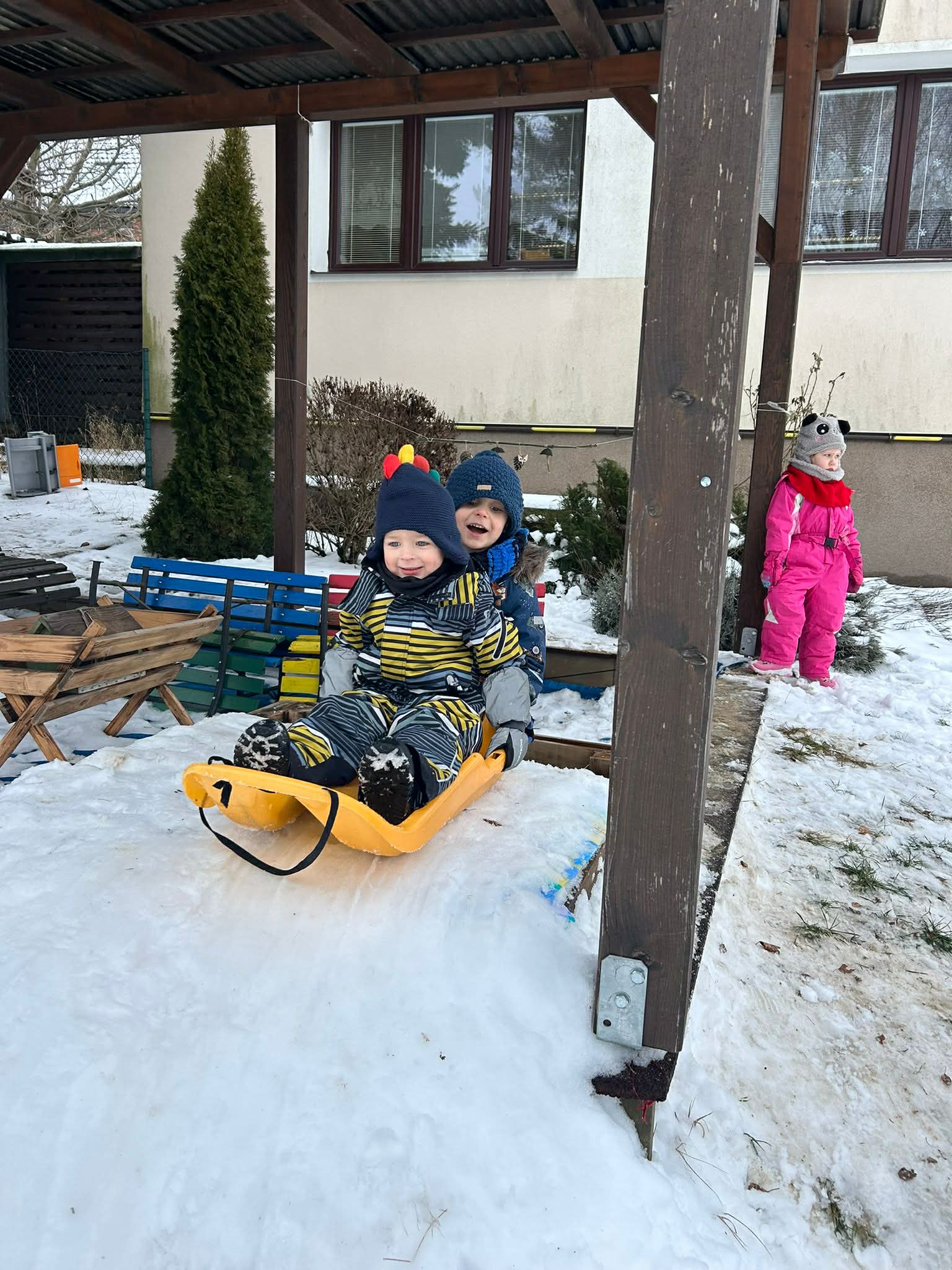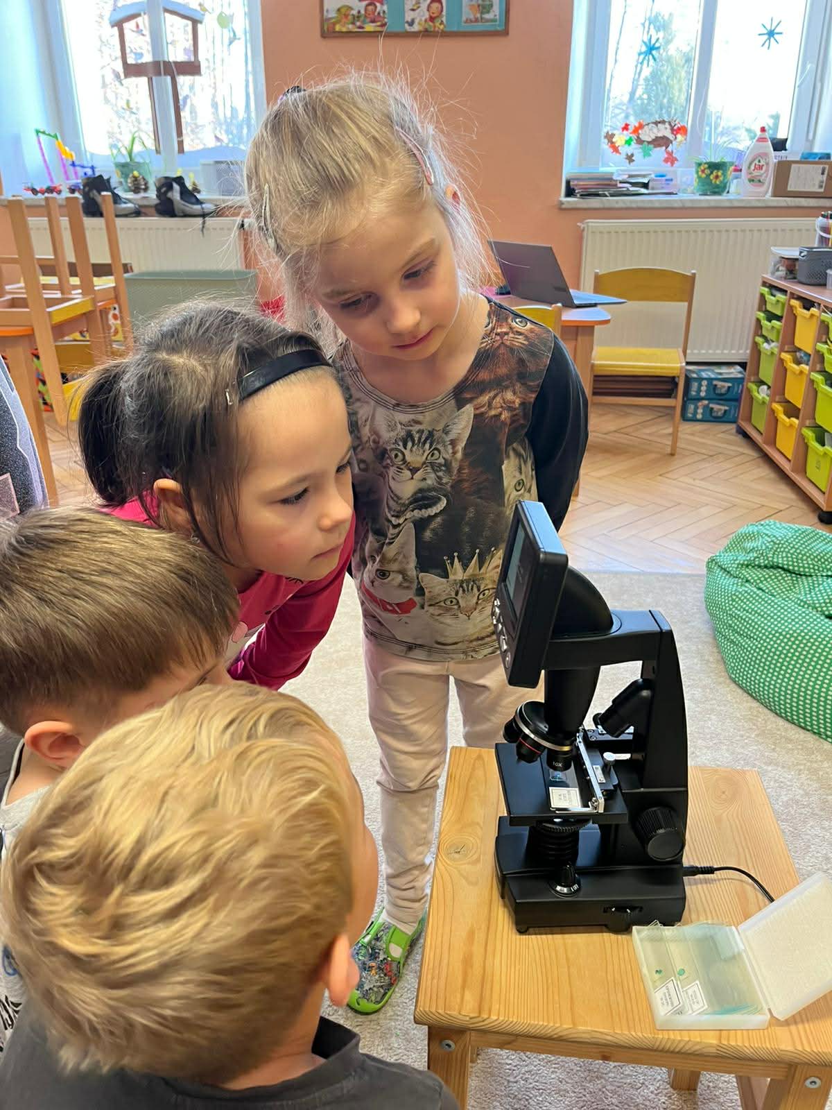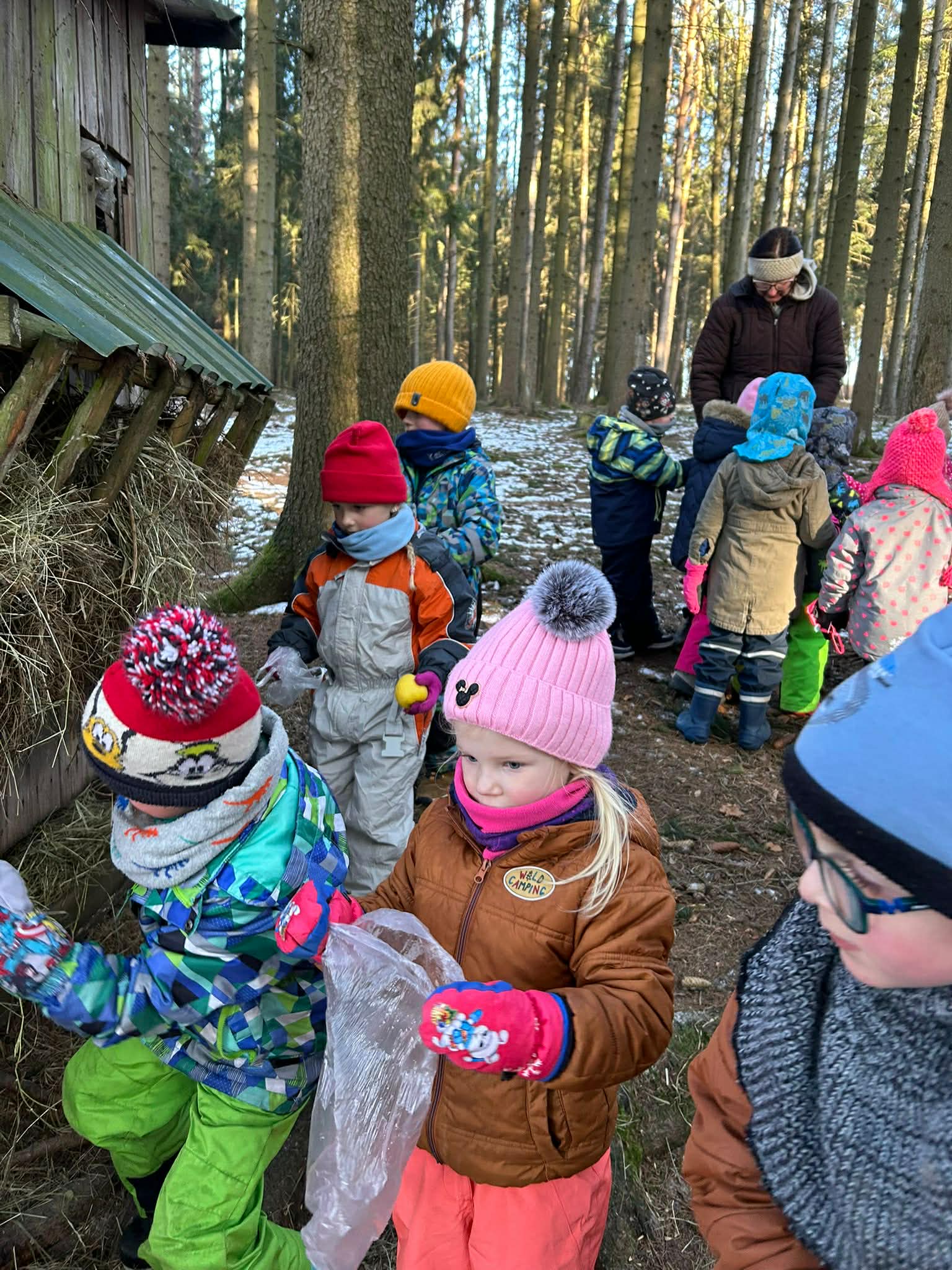 Práce s mikroskopem, detektorem kovu je oblíbeným nástrojem k poznávání, a v naší školce rozhodně nechybí. Zima nám letos přála a sněhu bylo dostatek, sáňkování a stavba sněhuláků nepatřila pouze naší školní zahradě. To, že zvířátkům v lese došly zásoby jsme pohlídaly a následně napravily donesením dobrůtek k místnímu krmelci.