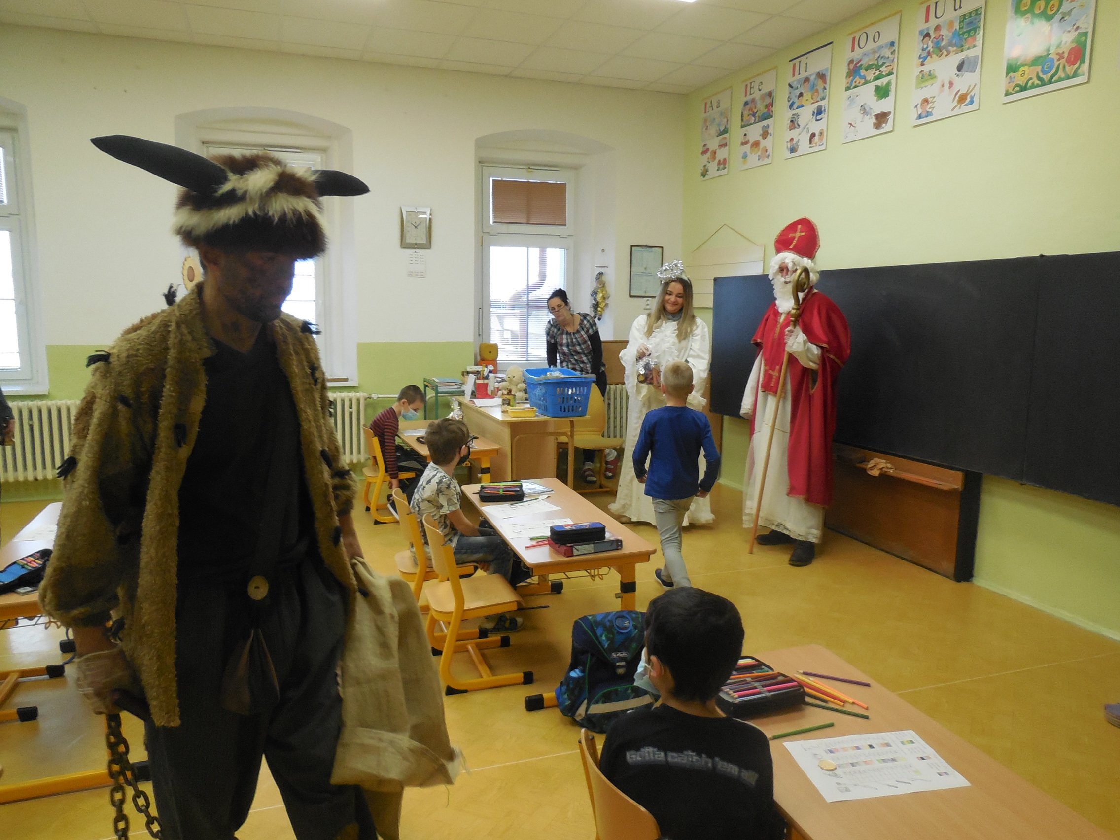 Děti a žáci zpytovali své dobré a špatné skutky před svatými bytostmi. Nakonec se všichni obhájili a Mikuláš, čert i anděl v doprovodu pana starosty po obdarování dětí odešli s prázdnou. Mikuláši, moc děkujeme za bohatou nadílku!