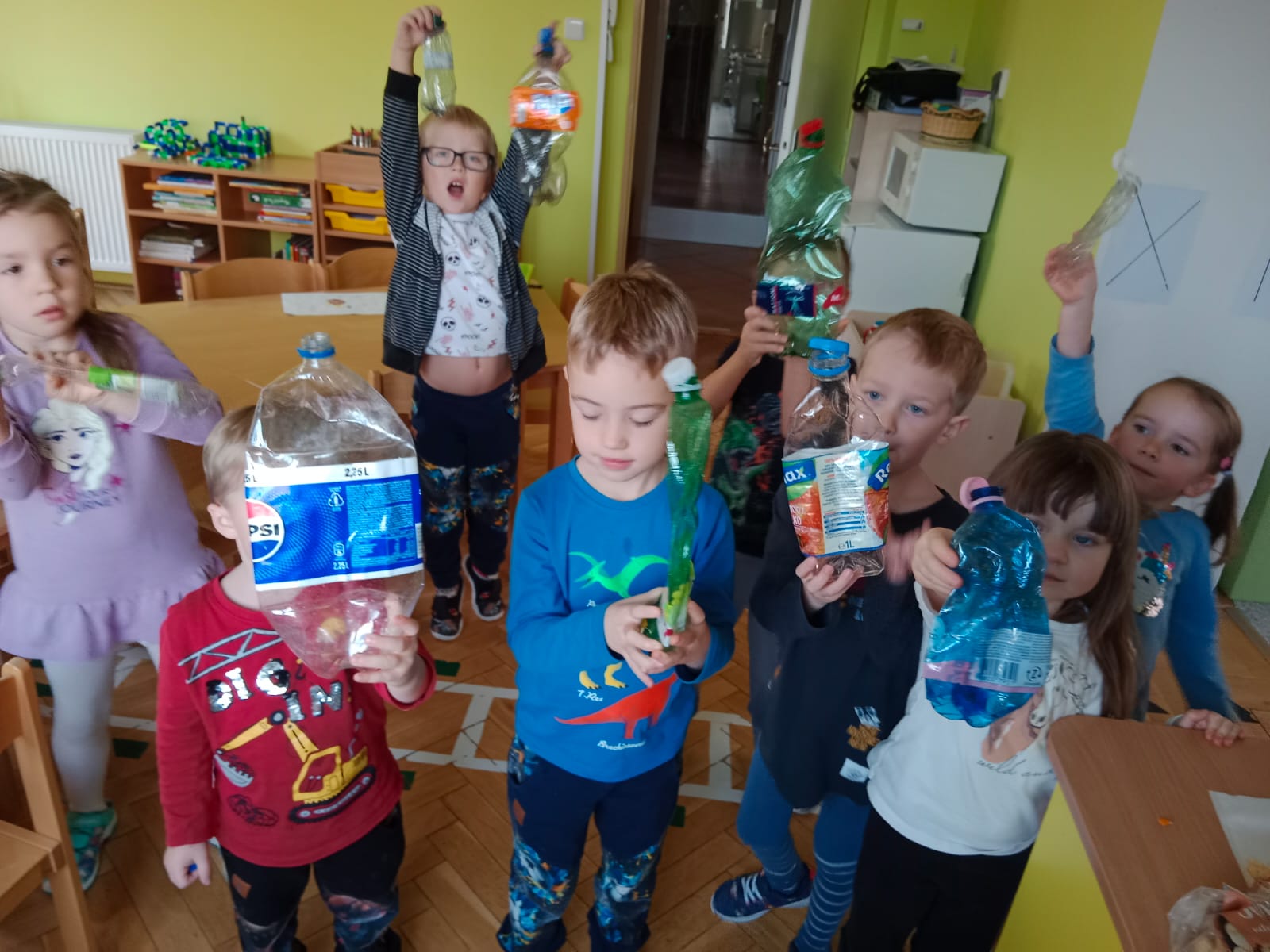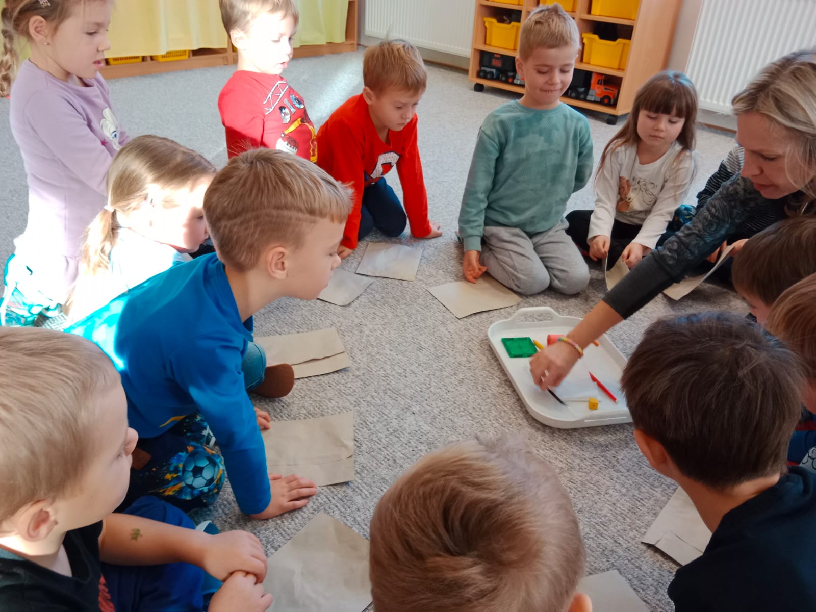Téma „Co si koupím?“ jsme začali malou oslavou Dandových 5. narozenin a odpálili si tak obří dětské šampaňské. Vyzkoušeli jsme si naši paměť, když si děti měly zapamatovat, pro co je maminka poslala do obchodu. Pojmenovali jsme si obchůdky a přiřazovali k nim zboží. A taky jsme si povídali o obalech na různé výrobky a potraviny. Děti z nich pak stavěly co největší věž. Do školky přinášely i pet lahve – porovnávali jsme jejich velikost a přemýšleli, jak je všechny nasoukat do malého koše na plasty. Nakonec je děti pečlivě sešlapaly a bylo vyhráno. Splnili jsme další část celoročního cíle v Recyklohraní. Zahráli jsme si i Kimovku, při které si měly zapamatovat 10 předmětů ze třídy a přinést je v papírovém sáčku. Blížili se vánoční trhy, proto jsme vykrajovali ze samotvrdnoucí hmoty ozdobičky, malovali jsme je fixem a použili je do voňavého vánočního sáčku nebo na stromečky omotané vlnou. Z červených korálků si děti tvořily krásné věnečky navlečené na drátky. To nás baví.