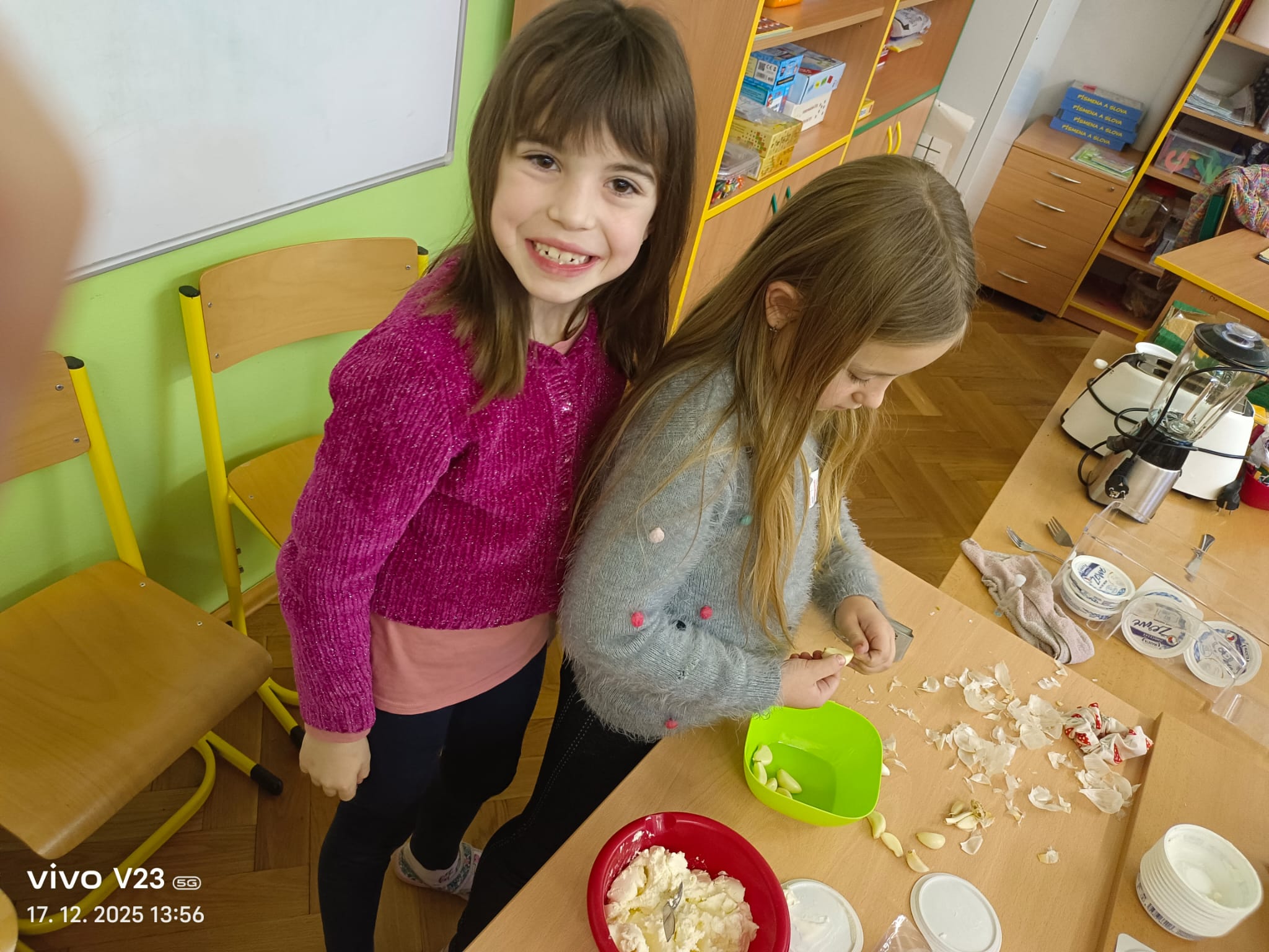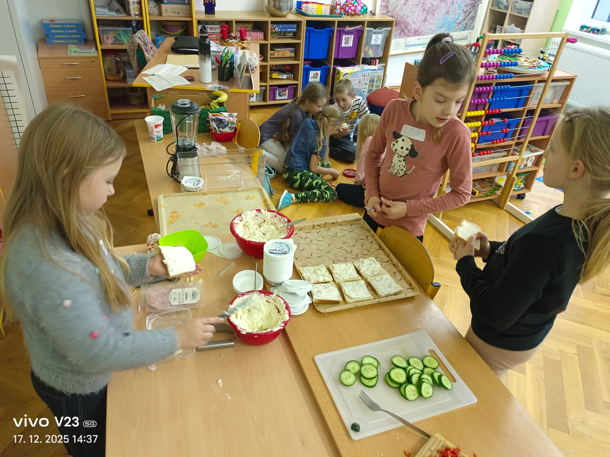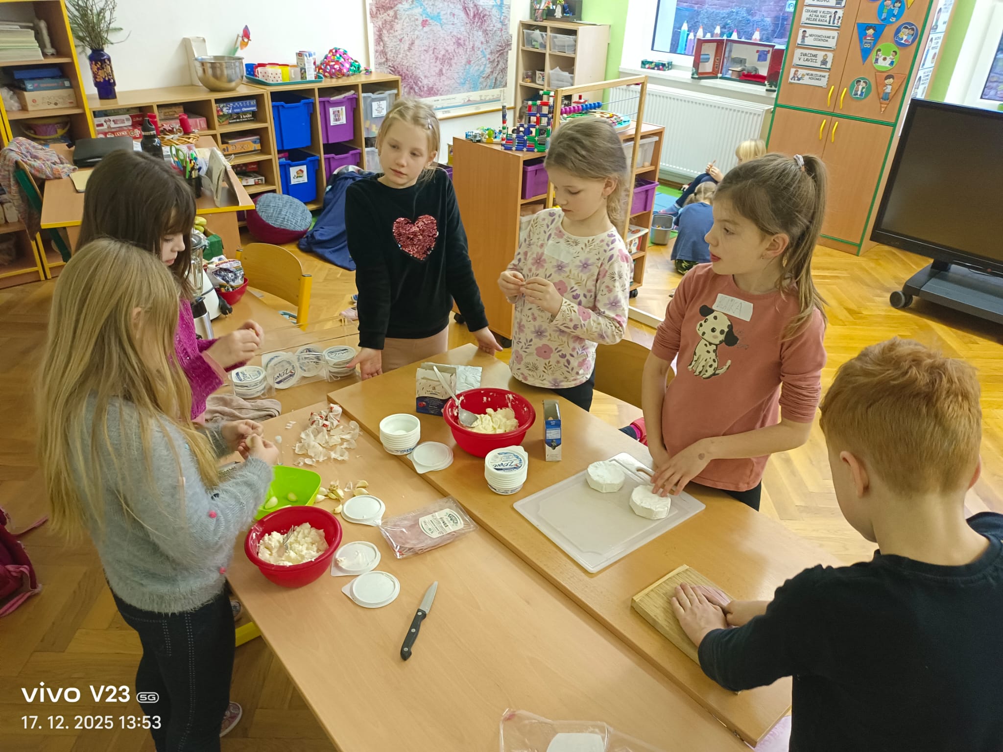 Dne 17.12. jsme si s dětmi ve školní družině zpříjemnili odpoledne výrobou pomazánek a koktejlů. V rámci projektu "Mléko do škol" děti dostaly žervé a mléko, a tak jsme toho využili a vyrobili si dvě pomazánky a dva koktejly. Pomazánky byly - česneková a hermelínová a koktjely - borůvkový a banánový. Dětem se vše moc povedlo a na svých výrobcích si velice pochutnaly.