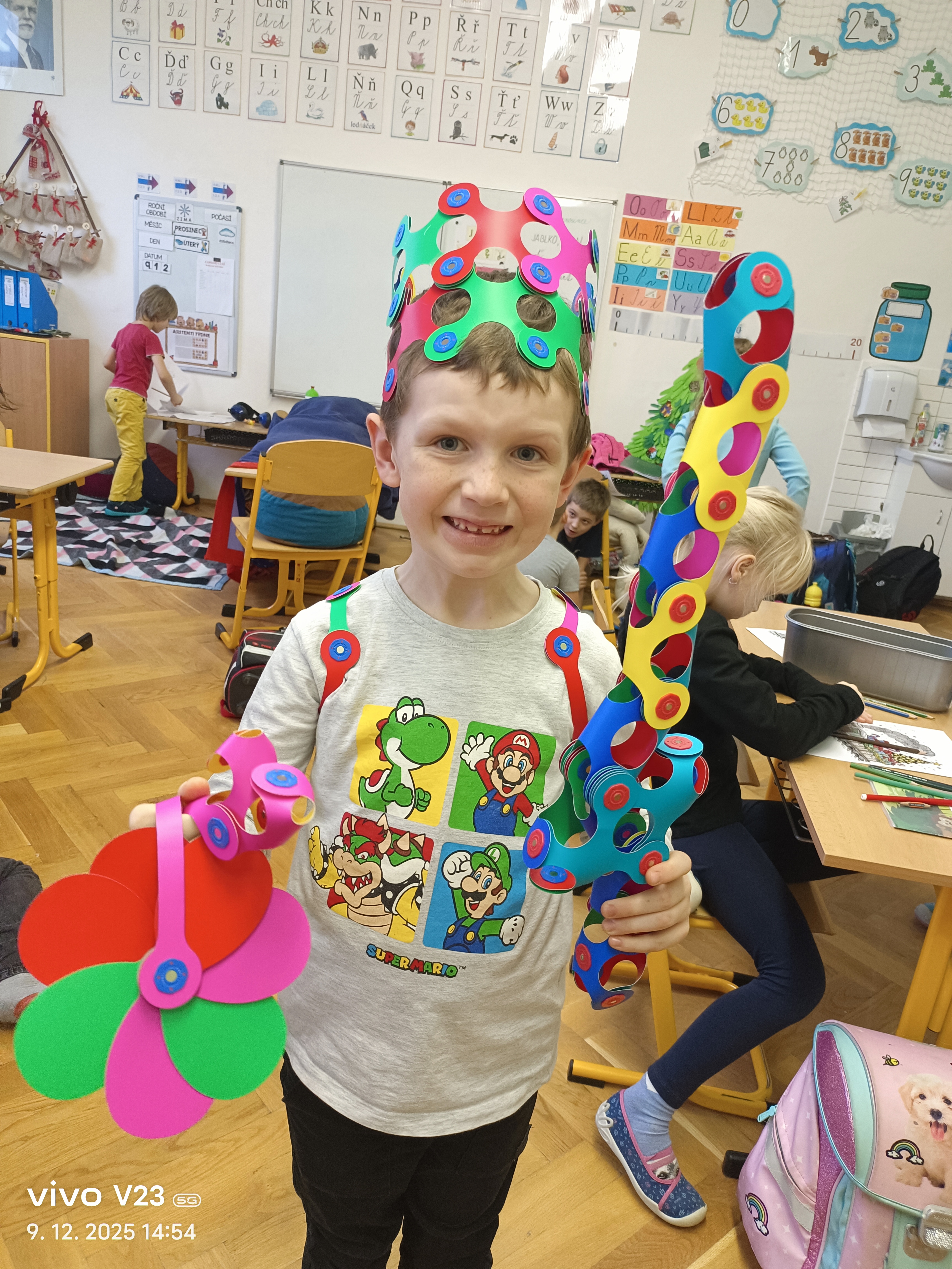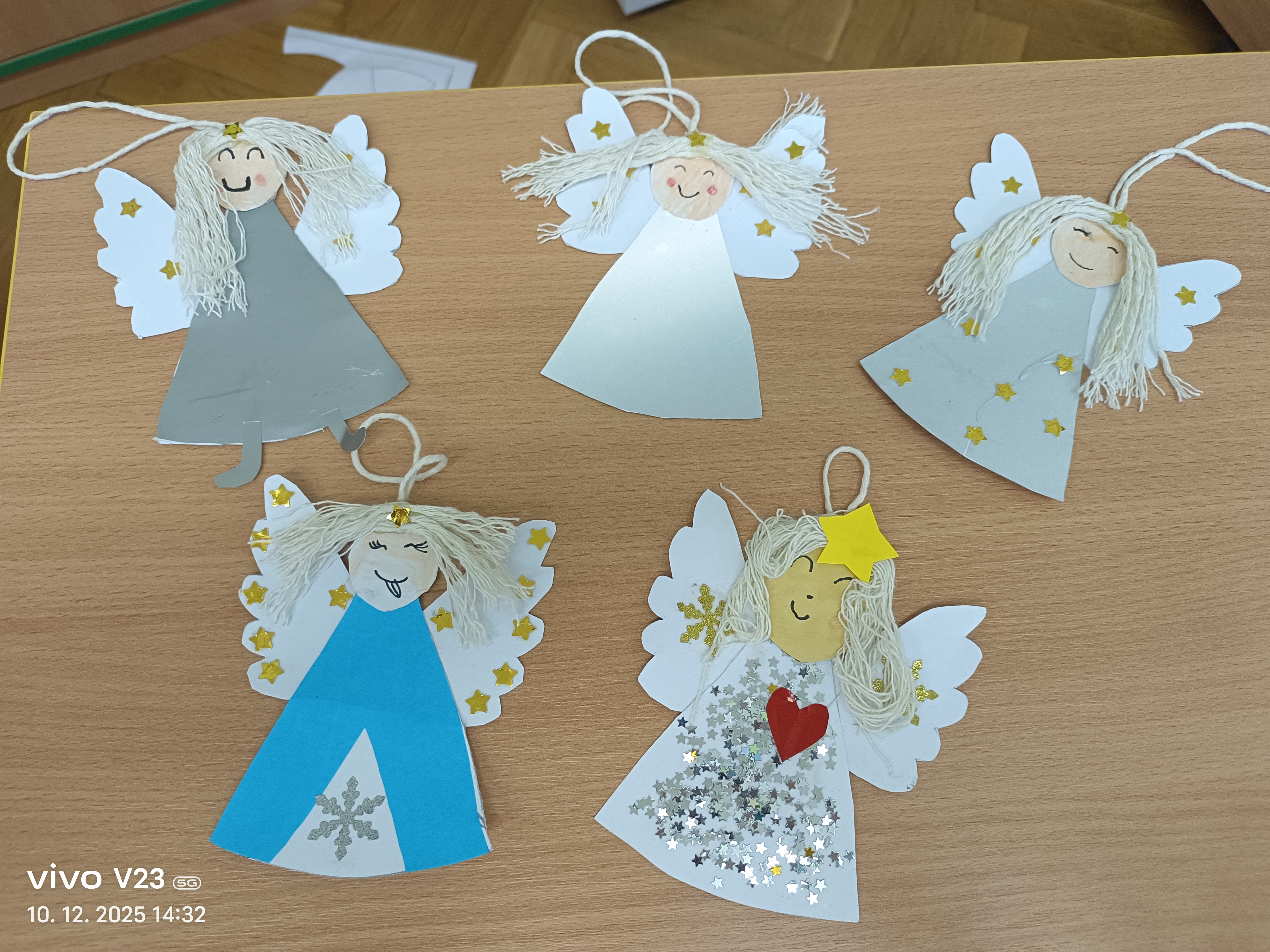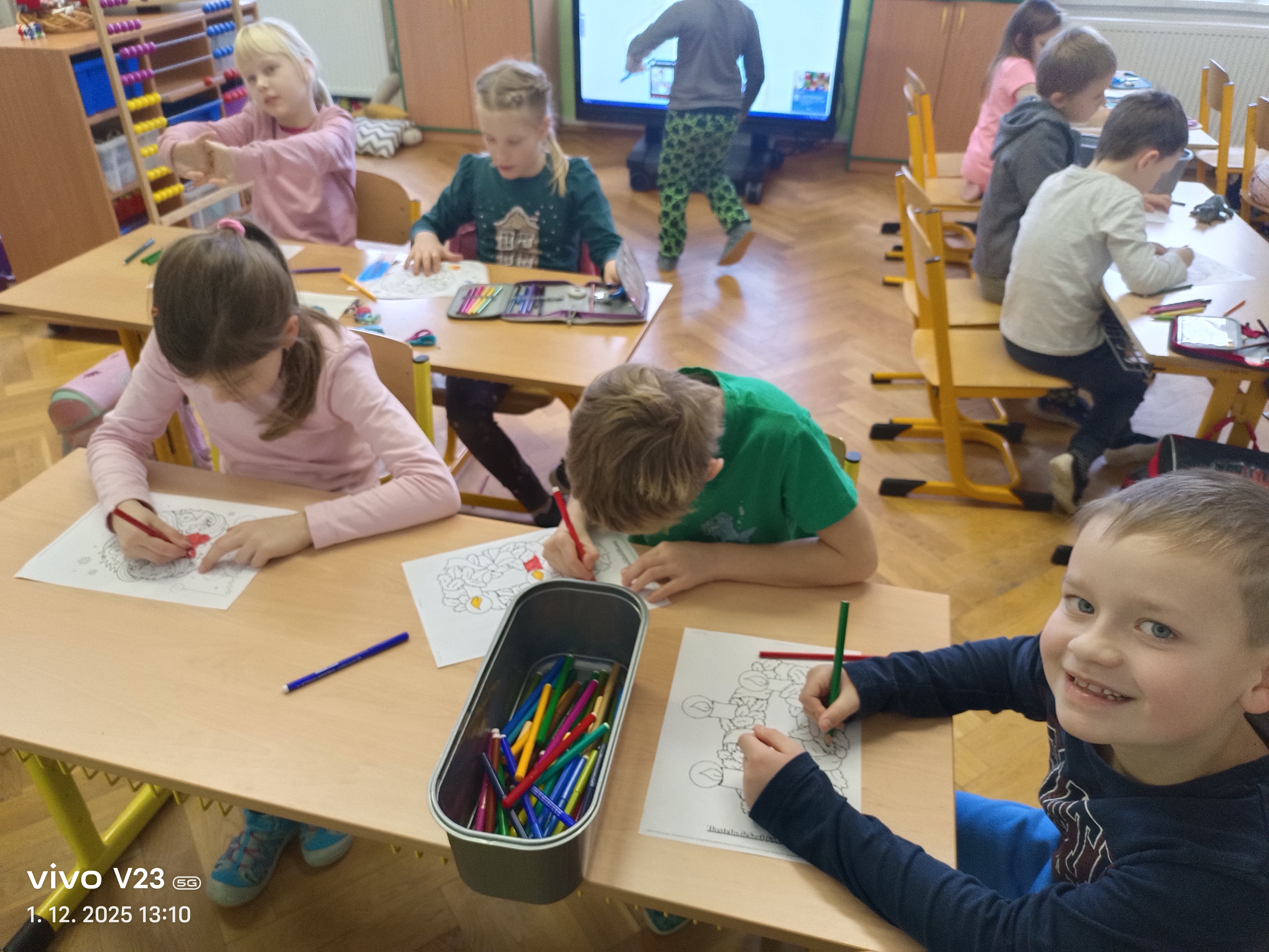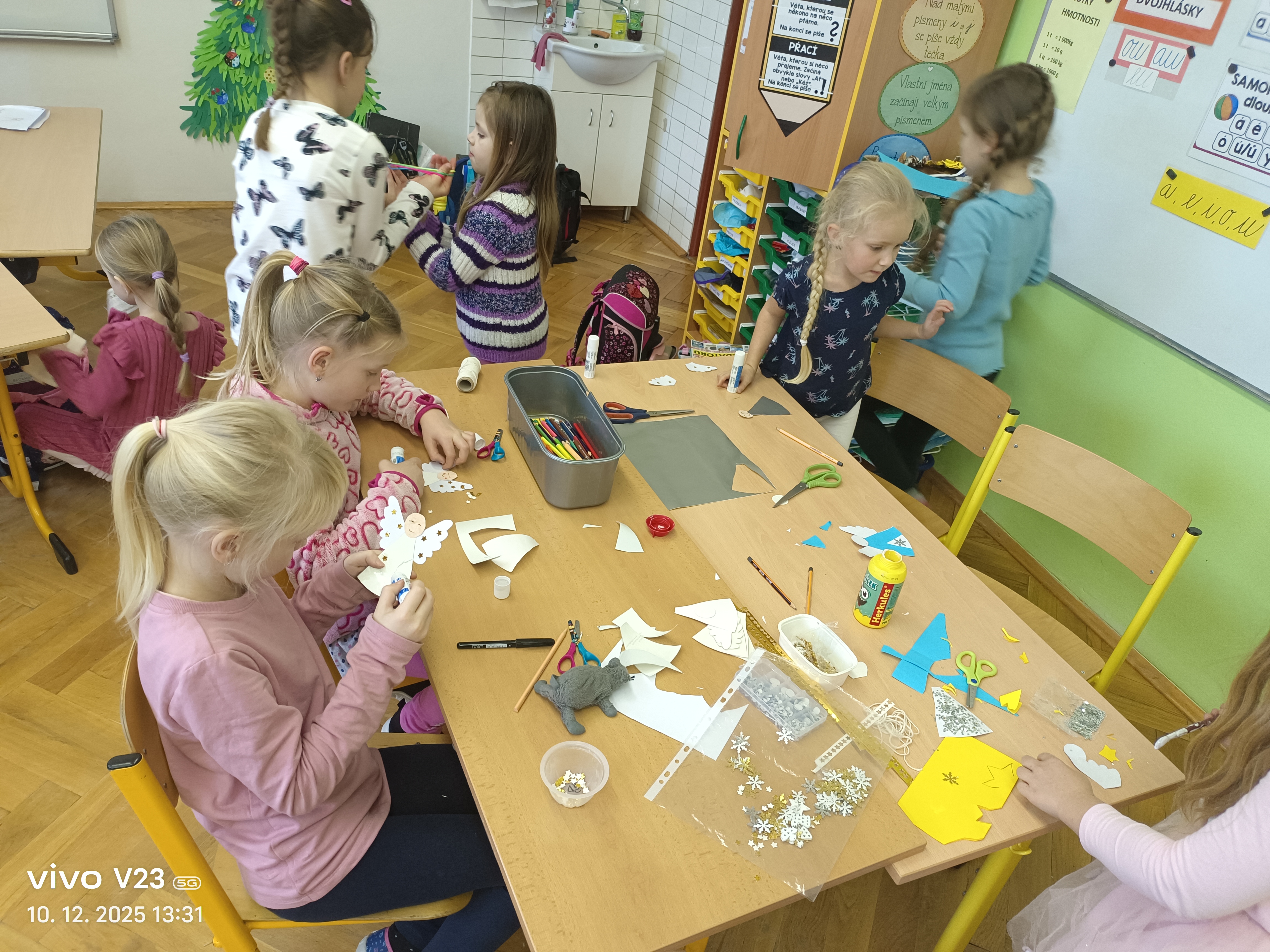 Začátkem měsíce jsme se věnovali povídání o adventu a více si rozebrali celý adventní čas. Na interaktivní tabuli jsme se podívali na pohádku o adventním věnci a více si tuto tradici vysvětlili. Poté děti soutěžily o nejkrásněji vymalovaný adventní věnec. Další výtvarnou aktivitou bylo tvoření obrázků se zimní a vánoční tématikou za pomoci inkoustu a zmizíku . To děti moc bavilo. V rámci relaxačních činností si děti oblíbily kreslení podle předlohy na interaktivní tabuli a také tvoření z korálků. Další oblíbenou hrou byla hra na fitcentrum a masážní salón. Děti byly moc šikovné a nápadité a do své hry zapojily i paní učitelky . Jako každý měsíc i tento vznikaly zajímavé výrobky z našich stavebnic . V rámci pracovních činností si děti v době příchodu Mikuláše, čerta a anděla vyrobily krásné andílky . Ani v prosinci nechybělo představování knížek, které si děti vybraly a vypůjčily v obecní knihovně. Proběhl také den zdravých pomazánek a koktejlů, který byl již zmíněn ve zvláštním příspěvku . Jako každý rok nemohlo ani letos chybět tvoření vánočních přáníček. Tentokrát to byla přáníčka s fotkou dětí pro rodiče nebo prarodiče, která mohla být použita i jako ozdoba na vánoční stromeček .