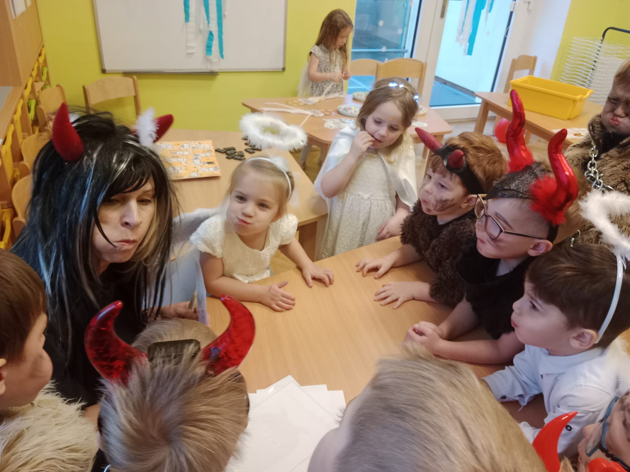A je tu prosinec, čas příprav na vánoční svátky. První téma „Nebe, peklo, ráj“ nás zavedlo mezi čertíky, andílky a taky za Mikulášem. Ve třídě si děti vyzkoušely čertovské a andělské skládanky, počítaly a kolíčkovaly správné odpovědi nebo přiřazovaly co k dané postavě patří. Taky jsme tvořili roztomilé čertíky z papírových sáčků nebo si děti vyzkoušely kreslit ornamenty na andělské ozdobičky pomocí zmizíku. To je moc bavilo. Skládali jsme taky kapříky z kartonových dílků a pak je tiskali na čtvrtku. Celý týden jsme pak zakončili projektovým dnem „Nebe, peklo, ráj“, kdy děti přišly v kostýmech čertů a andílků (letos bez Mikuláše) a společně jsme si zatančili na pekelnou světelnou diskotéku kolem kotle s ohništěm. Potom nás čekala krásná promenáda v nápaditých kostýmech a následovaly soutěže a hry – andělské chodníčky a házení vloček, čertovská kuchyně, dílna pro šikovné andílky a čertíky a taky Mikulášova překážková dráha.