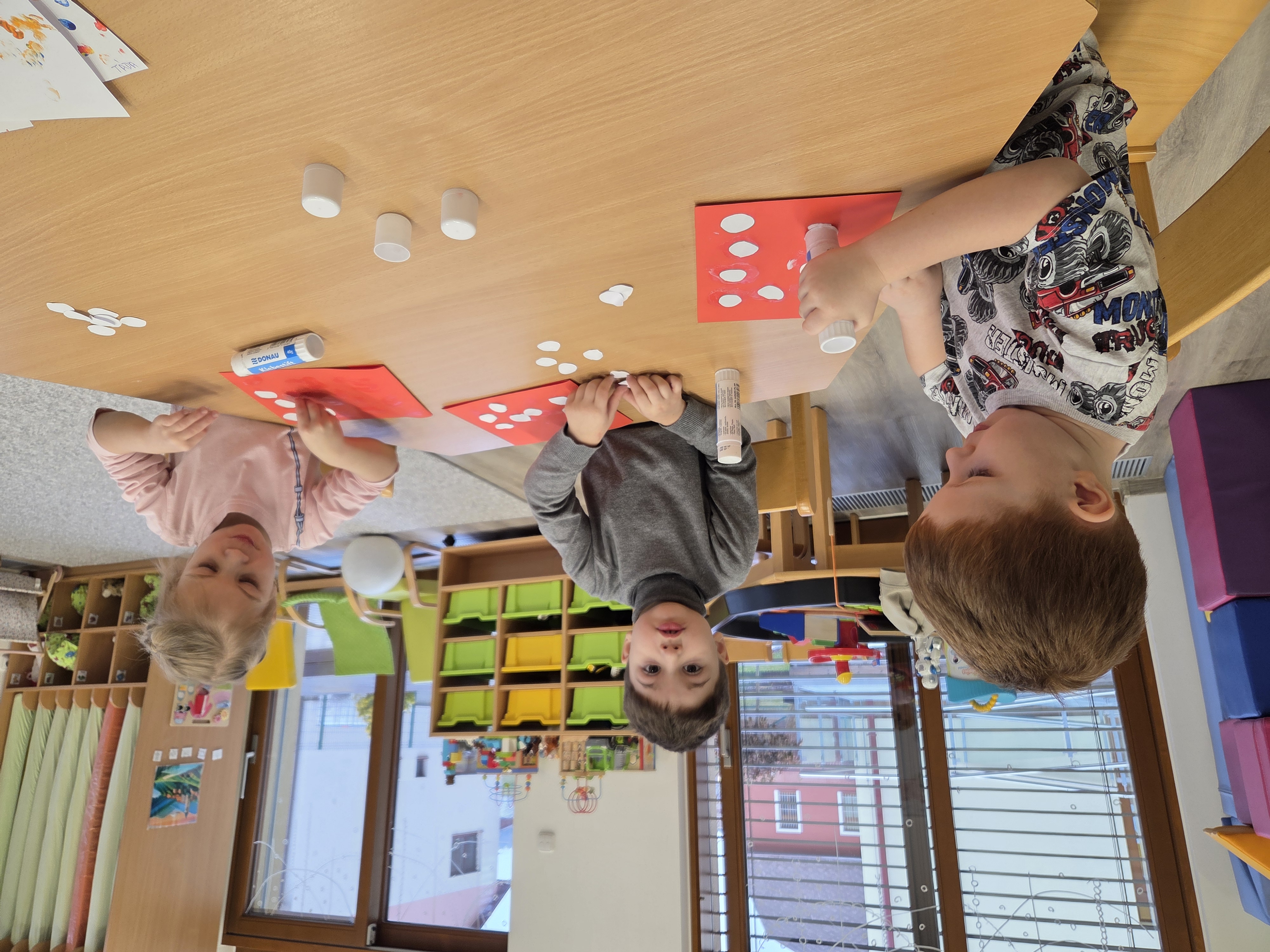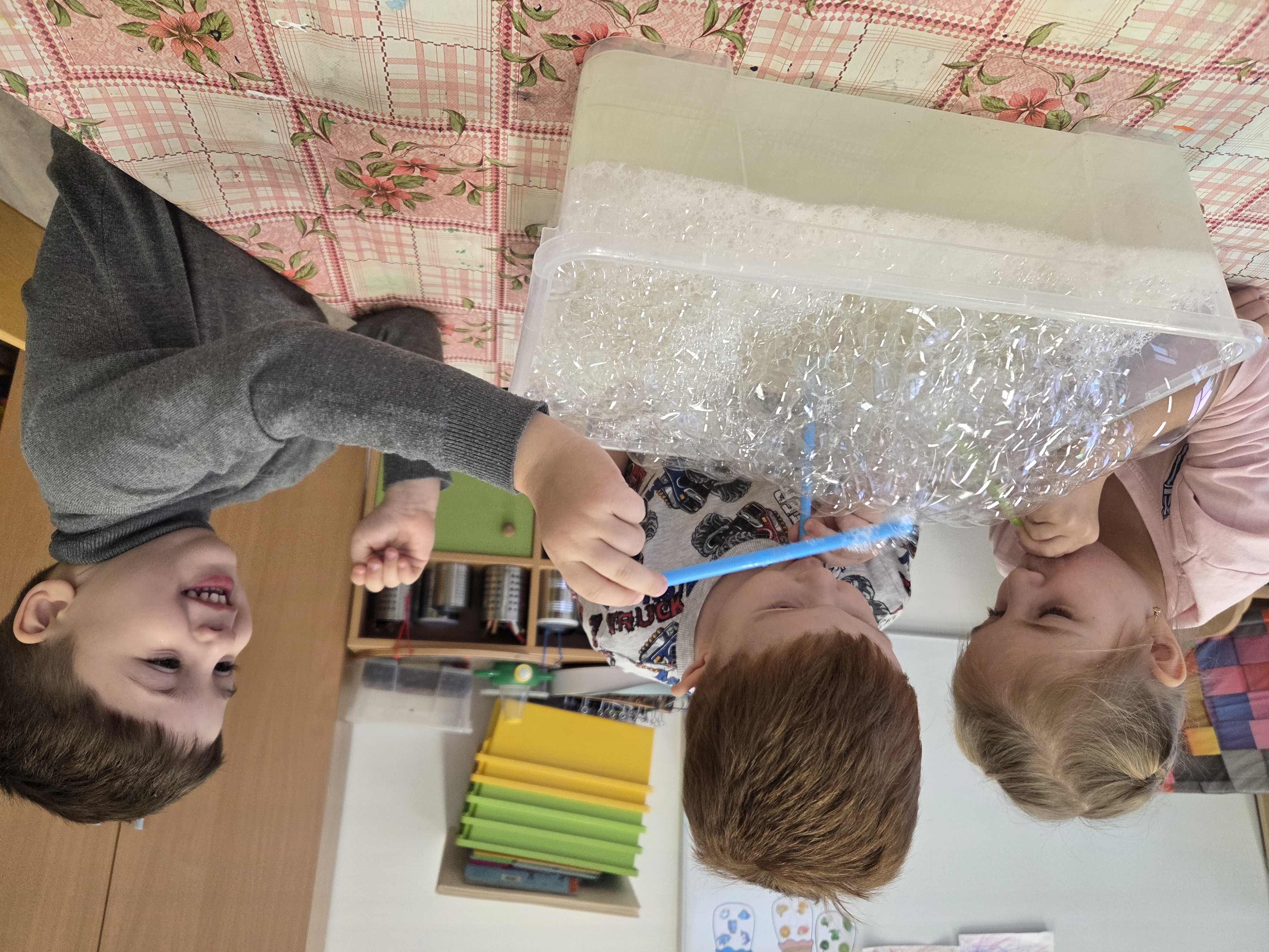 Po vesmíru následovalo pohádkové téma, kde jsme pracovali s pohádkou ,,O třech prasátkách“ a ,,Hrnečku, vař!“. Pohádky si děti poslechly, zkusily je převyprávět svými slovy a také si je zkusily zahrát pomocí papírových loutek, což byla opravdu velká zábava. Na motivy těchto pohádek děti tvořily i různé výrobky a obrázky, které vyzdobily nástěnku pro potěchu všech.