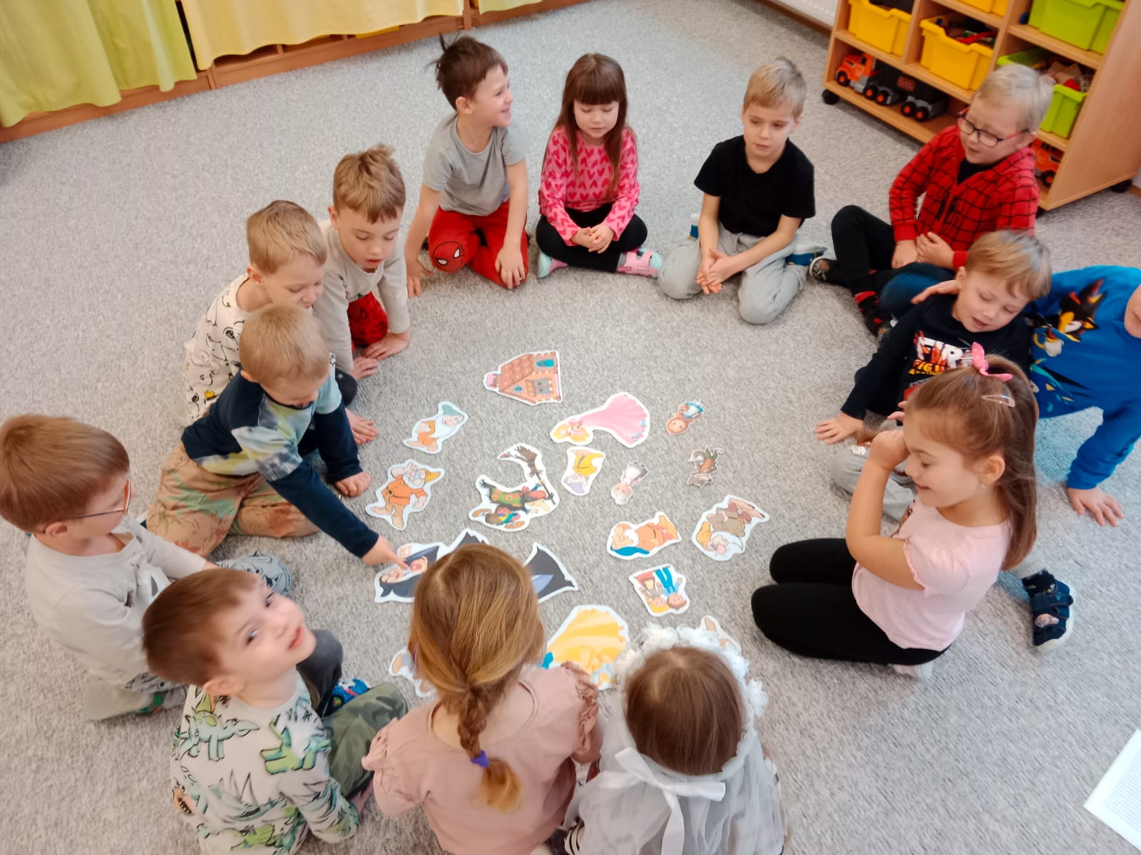 Druhý týden a téma „Povídám, povídám pohádku“ jsme přemohli zlého čaroděje, který nechal zmizet všechny pohádkové bytosti z našich obrázků. Děti hledaly ve 4 družstvech stejné tvary klíčů, kterým odmykaly zámky kouzelníkova hradu a vysvobodily pohádkové postavy zakleté do drahokamů (nafukovacích balonků). S pohádkou „Kocour v botách“ si děti sestavily posloupnost příběhu s obrázky podle přečteného textu. Zazpívali jsme si písničku „Pohádkový les“, která se nám moc líbila. Pohádky jsme četli, hráli, hledali nesmysly v popletené pohádce, vyzkoušeli si spoustu rozumových her jako je pohádkové sudoku, puzzle, pokračování v logické řadě, hledání stínů, rozdílů. Venku nás pak čekala pohádková stezka, kde jsme plnili pohádkové úkoly společně s menšími dětmi ze třídy Myšáků. A Nakreslili jsme si pohádkové postavičky a přilepily je na začarovaný jiskřivý podklad.