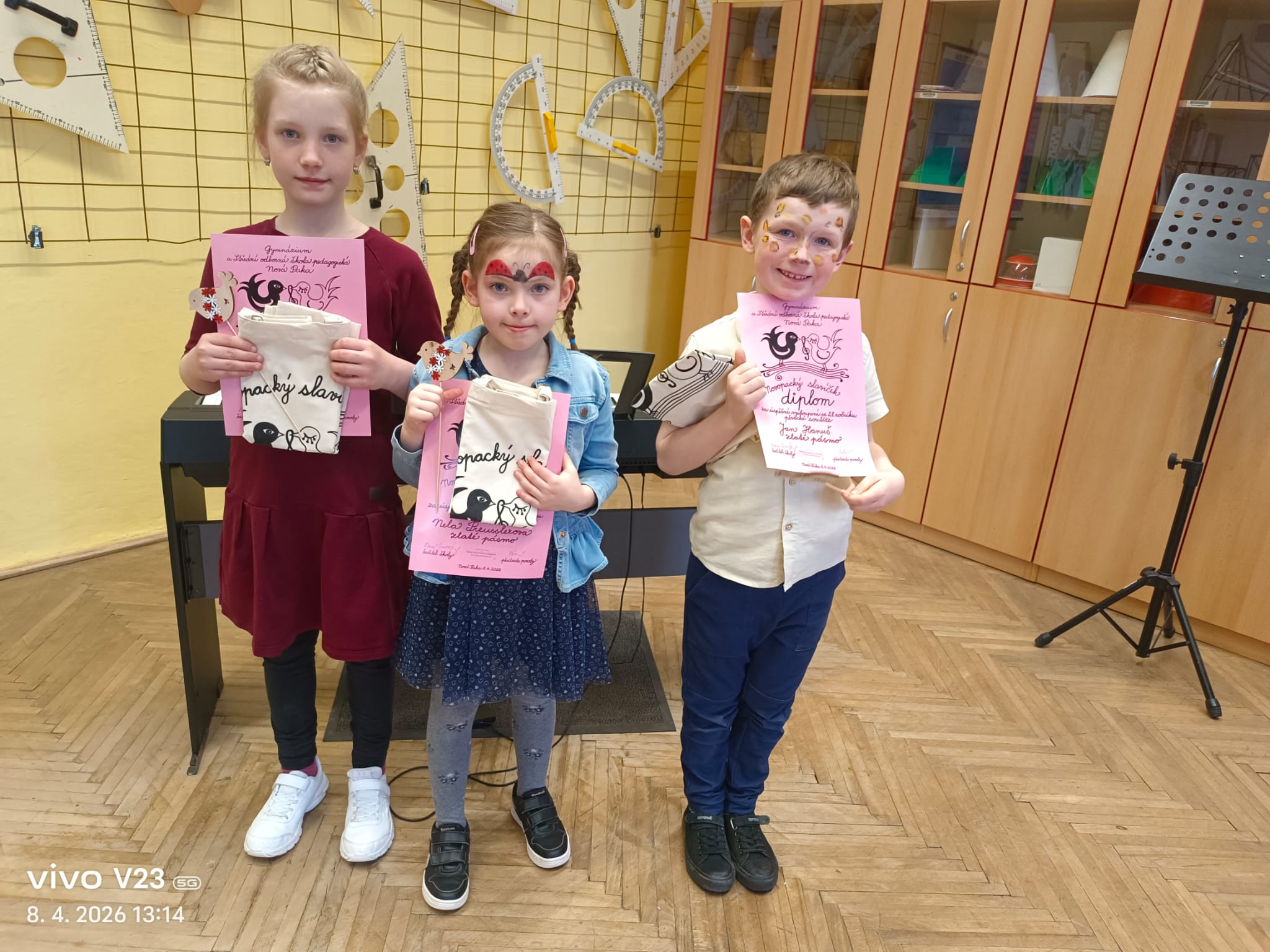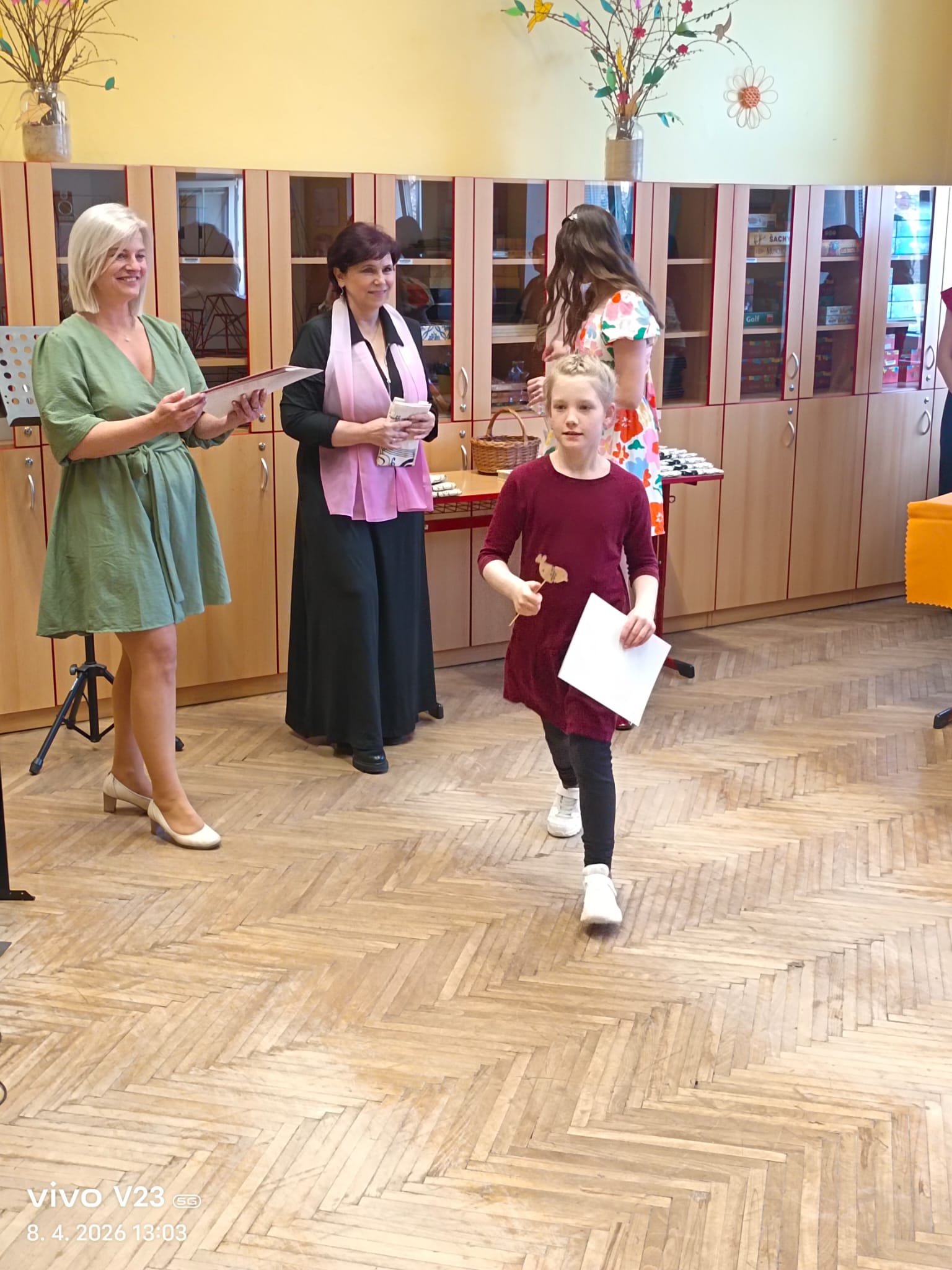 Největšího úspěchu jsme dosáhli v kategorii 1.–2. tříd, kde všichni naši zástupci – Nela Preusslerová, Jan Hanuš a Ella Štrynclová – získali ocenění ve zlatém pásmu.