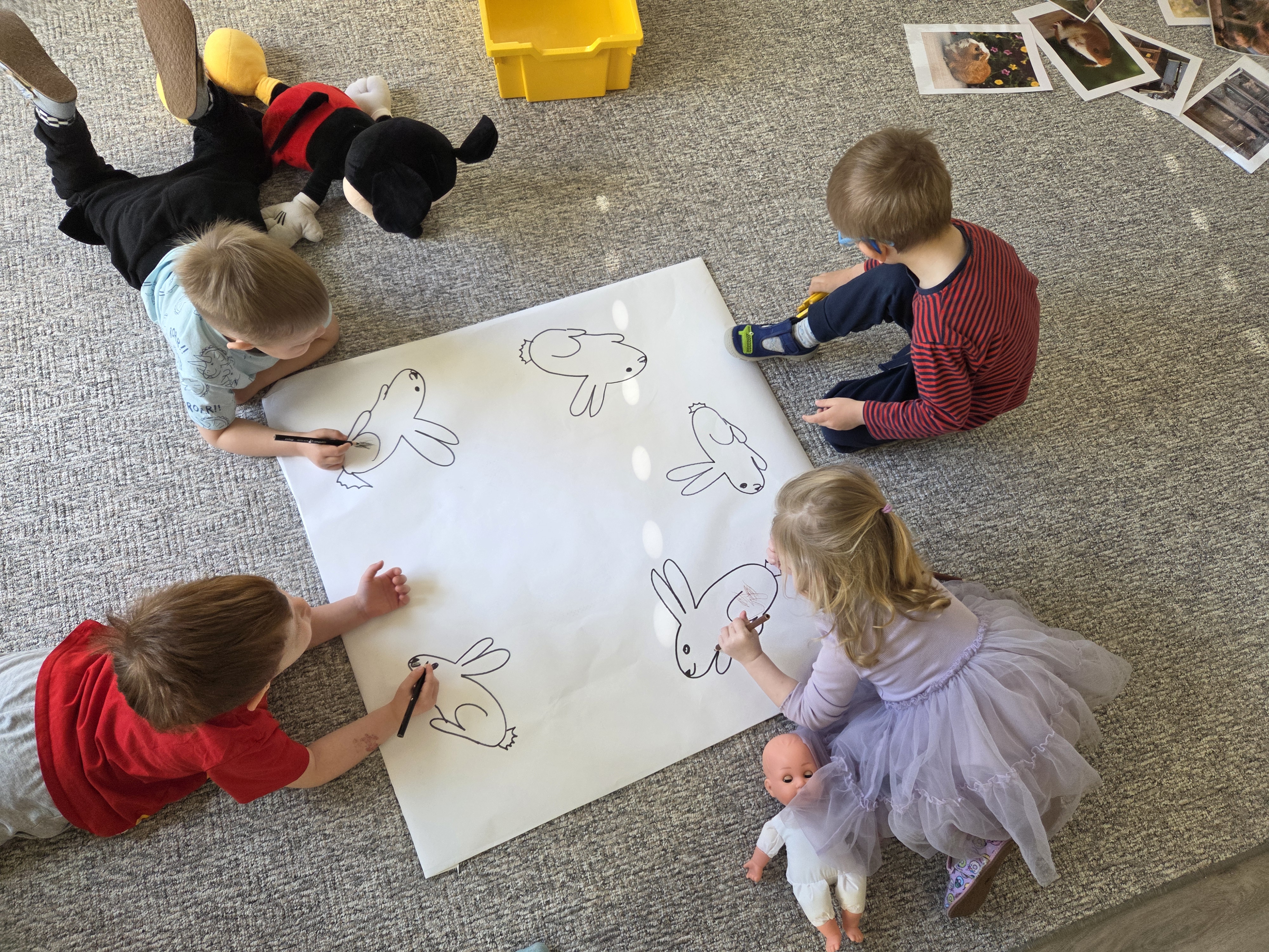 V pátek 17.4 jsme ve školce zakončili čtrnáctidenní téma Farma projektovým dopolednem. A abychom toto téma vzali více konkrétně, zaměřili jsme se během dopoledne tentokrát na králíky a morčata. Děti si prohlédly obrázky různobarevných králíků, různých králičáren a shlédly krátké video o krmení králíků. Mohly si osahat a přivonět ke slámě a senu a dozvěděly se, na čem tato zvířata spí a čím se živí. V tvořivých dílnách si děti mohly vyrobit papírové morče, které po slepení dokázalo stát. Jako překvapení pro děti byla návštěva živých morčat, které si děti mohly zblízka prohlédnout, nakrmit a pochovat. Tato návštěva měla u dětí obrovský úspěch, a tak ji třeba někdy v budoucnu opět zopakujeme.