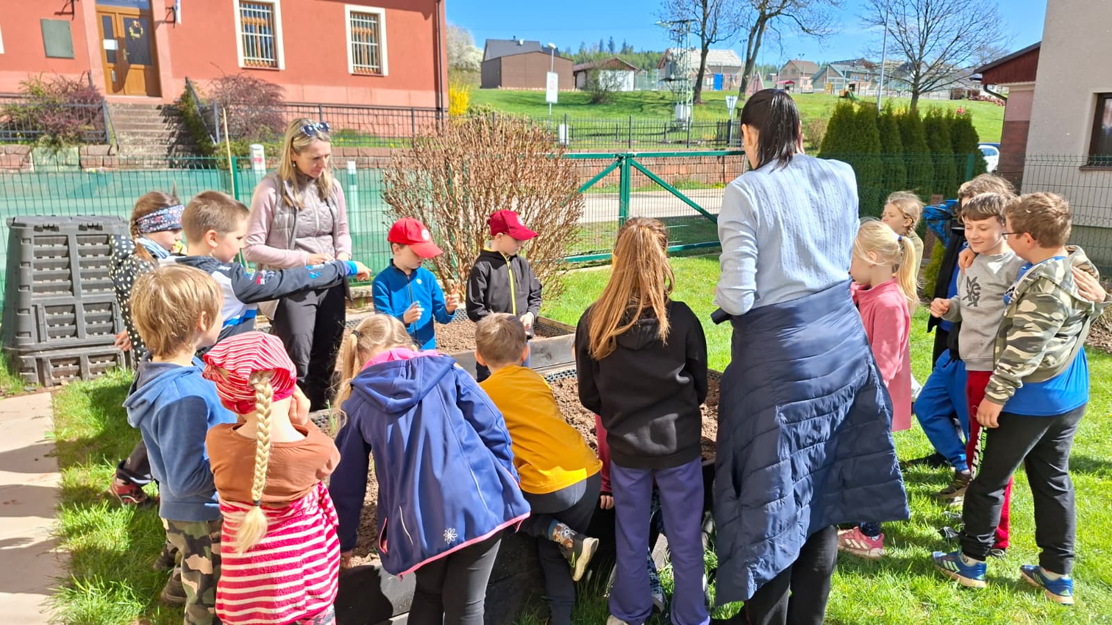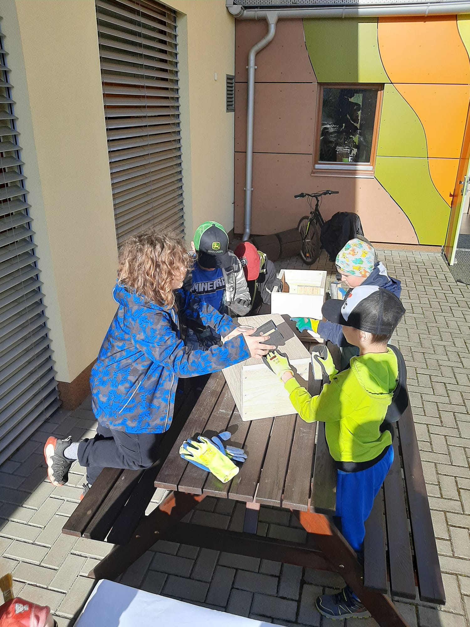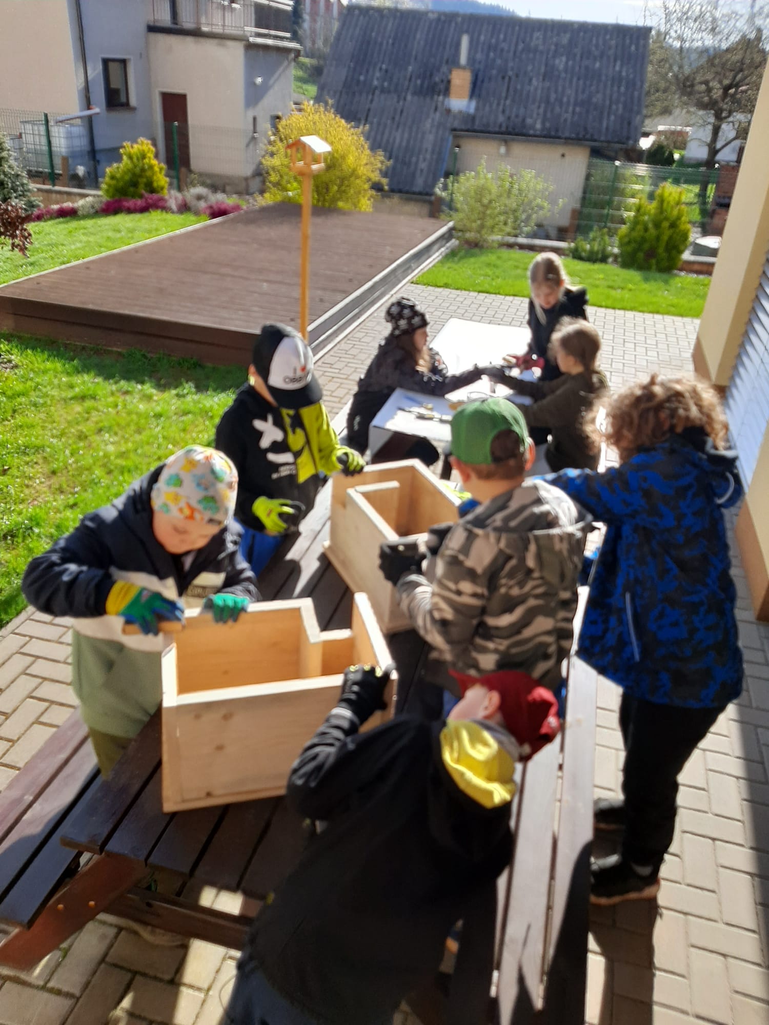 Žáci byli rozděleni do čtyř skupin a každá se věnovala jiné činnosti. První skupina se zaměřila na sběr odpadků v okolí školy, další uklízela prostor kolem školního hřiště – hrabala trávu, větve a listí. Jiní žáci se pustili do sázení rostlin a další brousili a natírali zhotovené ptačí budky a domečky pro ježky.